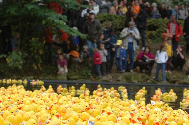 This Tübingen Duck Race competition is held in the River Necker near Stuttgart in Germany.Here 7000 yellow rubber ducks are use for the race,so the winner duck owner to be won €10.000.If you have no duck so don't worry there you can take this duck on rent,under this ducks there is a metal weight from this the duck runs.