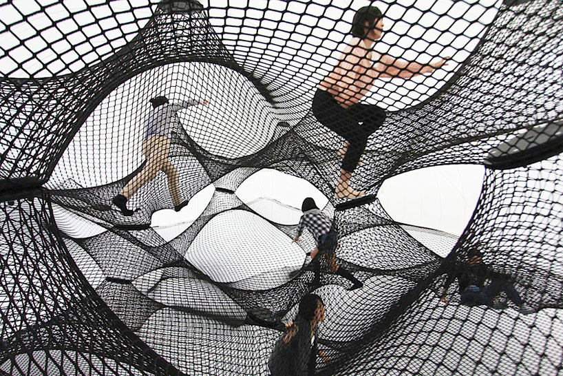 Croatian-austrian design collective numen/for use is best known for their large scale interactive sculptures, often using everyday materials like tape in their build. their most recent structure called ‘net blow-up’ is an inflatable, box-like space with buoyant black webs fitted tightly inside. the blown-up exterior skin creates an immersive interior cavity filled with a complex network of interwoven mesh material.