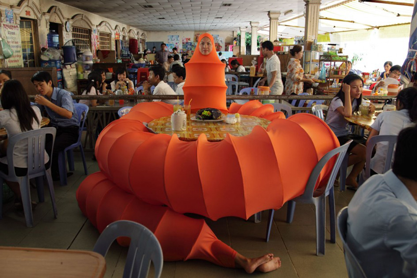 The 30-meter long personality corkscrews through the traditional cityscape, intertwining amongst the locals and their habitats, resulting in humorous and dreamlike scenarios. ‘meters and meters of textile act as skin, as a way for the surface of my body to extend into public spaces, and as a metaphoric device for stories to spread across an expanse.’,