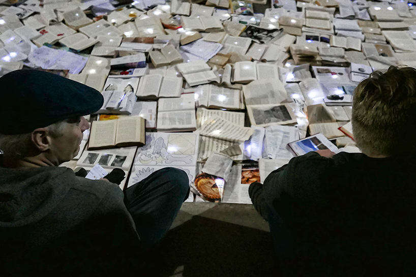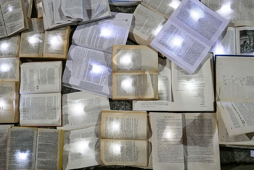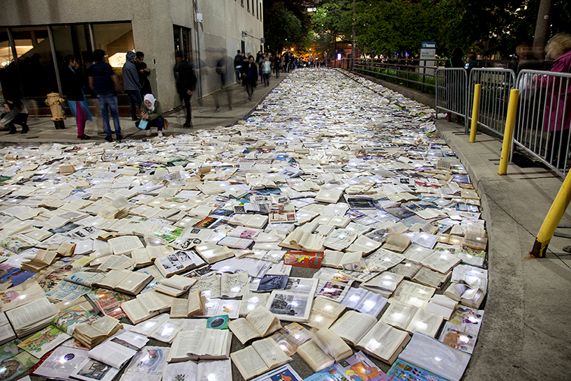 Many artist place the books and the light on the books and darkness on the convex.Fit right in at the moonlit fest. the ‘sleepless night’ where art and artists take over the streets set the stage for the group’s latest urban intervention, which saw them transform hagerman street into a twisting bayou of books.