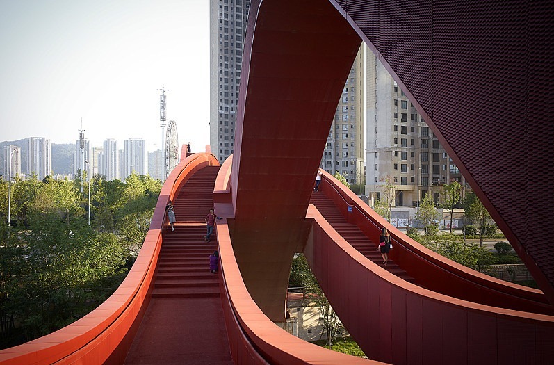 A bridge which has many routes in it allows the crossers to enjoy the differrent routs above the Dragon King Harbour River and the bridge known as Lucky Knot Bridge located in Changsha China.